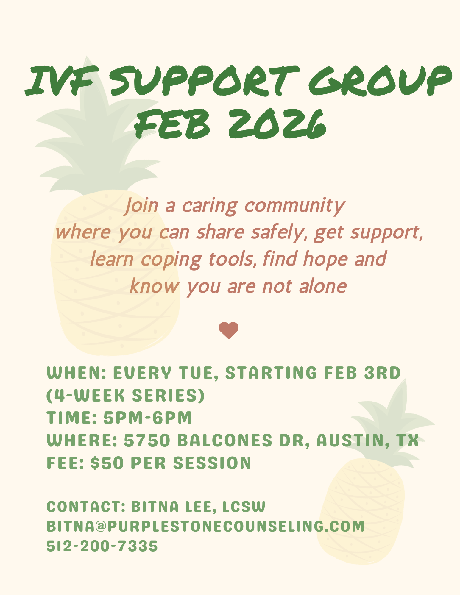 *I’m excited to share that a new in-person IVF support group will be starting on February 3rd, 2026, meeting every Tuesday from 5-6pm. The sessions will be held at my office: 5750 Balcones Dr, Austin, 78731. This group will be a 4-week series, meeting weekly, with a fee of $50 per session. We currently have two openings available. If you’re interested or would like more details, please feel free to reach out.